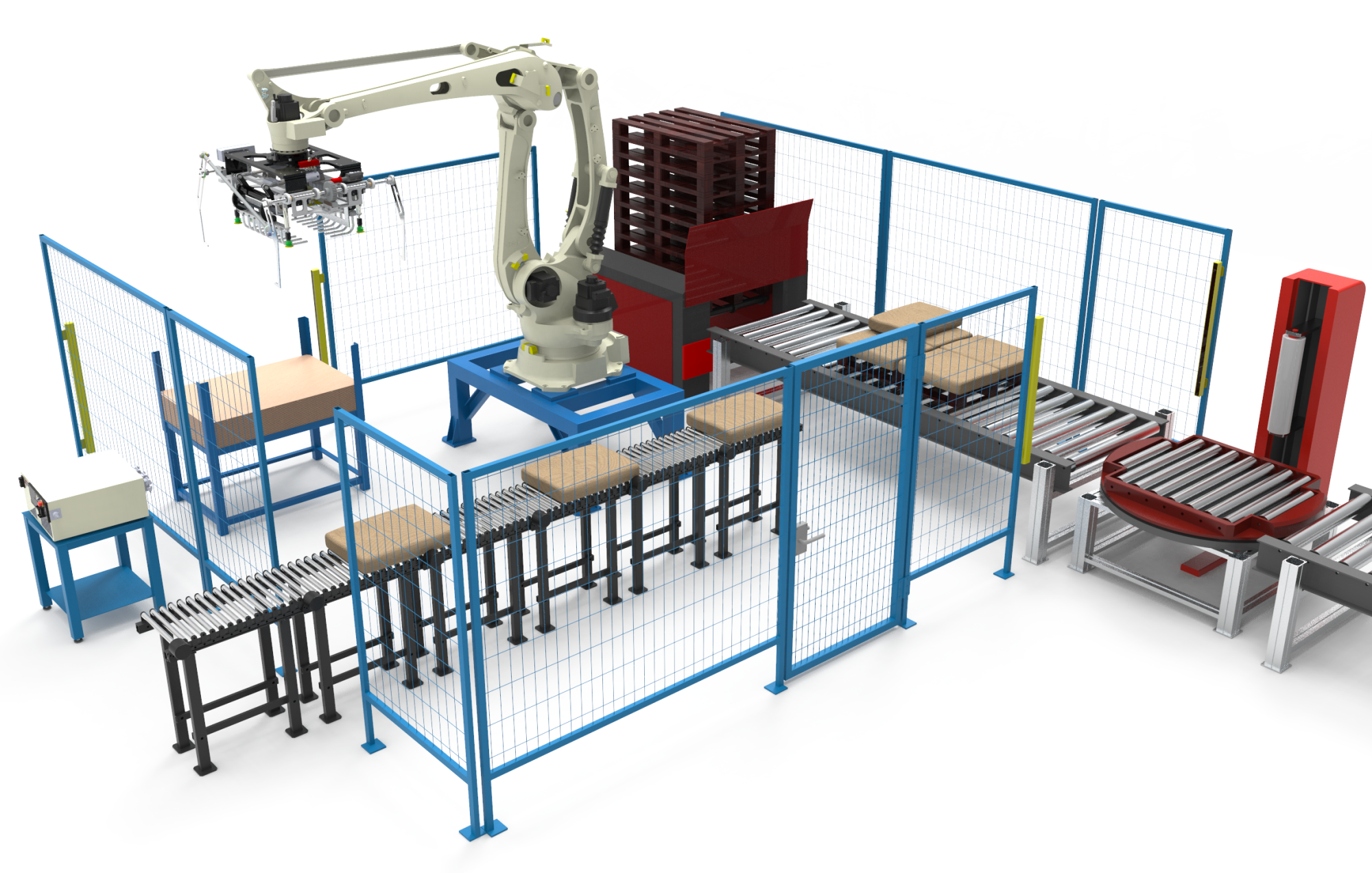 Комплекс на базе робота Kawasaki CP180L с конвейером подачи мешков в зону укладки, устройством хранения и подачи пустых палет, конвейером транспортировки палет и паллетообмотчиком. В состав комплекса также входит защитное ограждение и система безопасности «Cubic-S», которая блокирует работу робота при внезапном проникновении человека в рабочую зону.